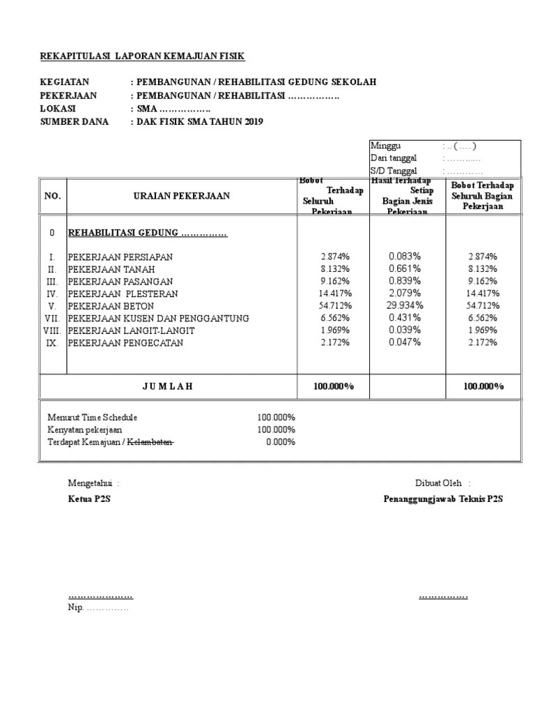 Format laporan bulanan dari pptk kepada pa/kpa. Sebelum membuat laporan mingguan proyek maka terlebih dahulu dibuat laporan harian proyek yang merupakan laporan per hari mengenai pekerjaan . Pekerjaan central drain plat luncuran air untuk petak 1 dan. Realisasi fisik dan keuangan (rfk) dinas pekerjaan umum, perumahan, dan kawasan permukiman (dpupkp) kabupaten sleman tahun 2021:. Total biaya yang diperlukan dalam kegiatan.